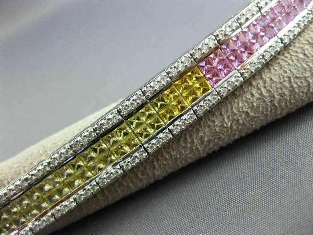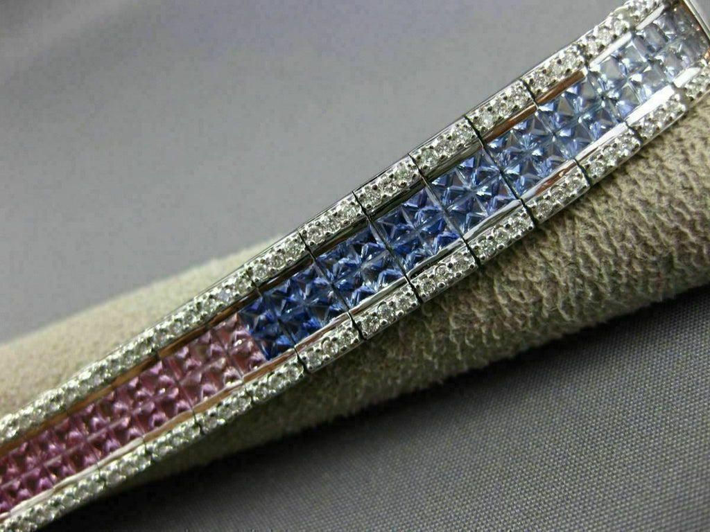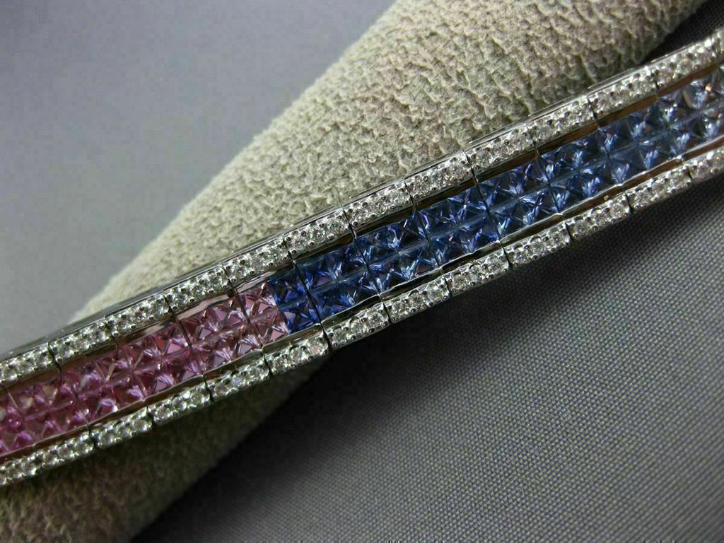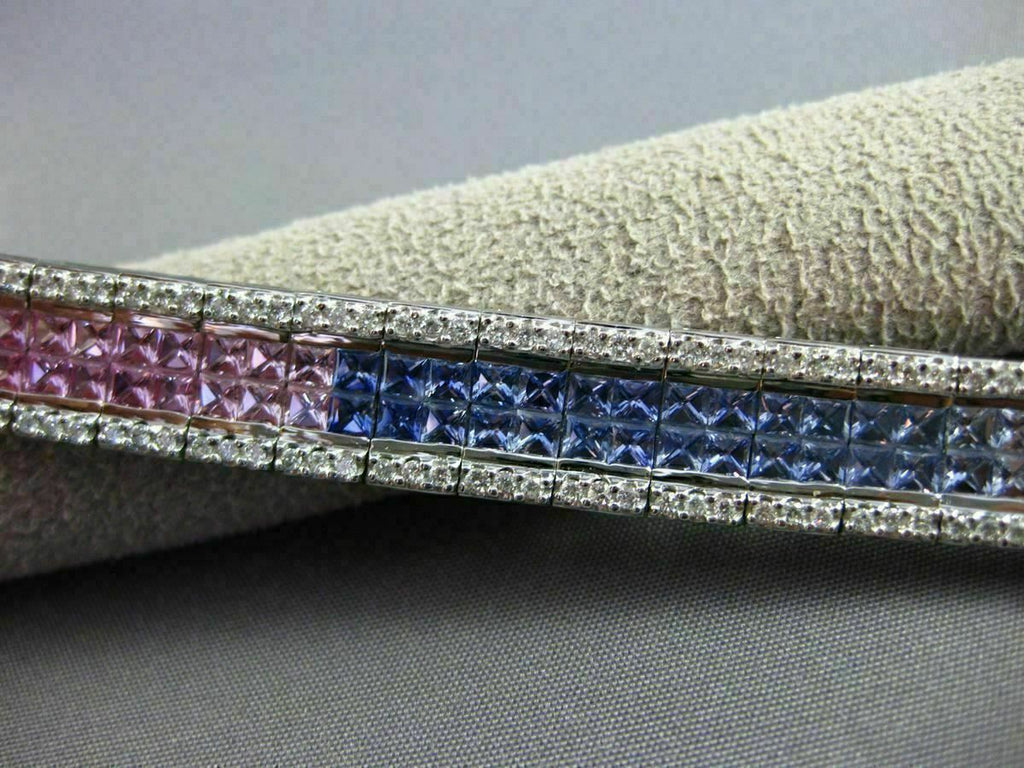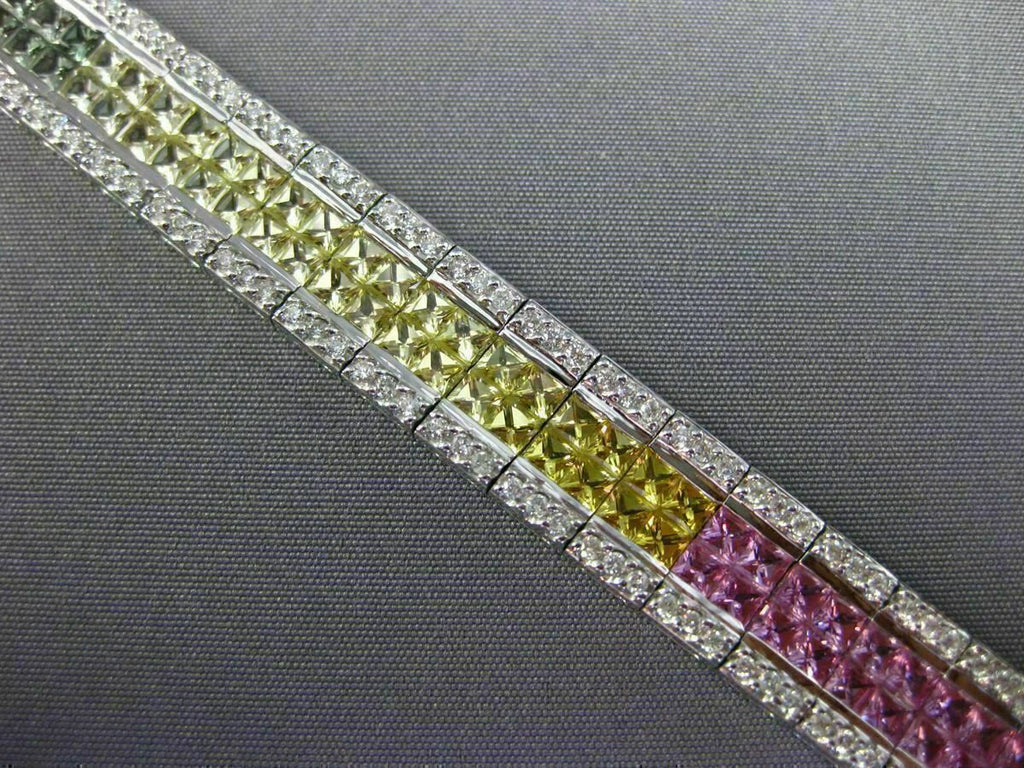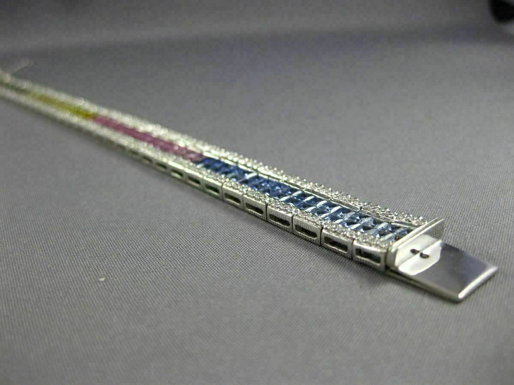 ESTATE WIDE 14KT WHITE GOLD TENNIS BRACELET. 3D MULTI ROW DESIGN. DIAMONDS ARE F/G COLOR, VSSI CLARITY 1.94 CARATS. AAA EXTRA FACET MULTI COLOR SAPPHIRE 13.13 CARATS. MEASURES 10mm WIDE. 7" INCHES LONG. WRITTEN APPRAISAL AVAILABLE. COMES IN A PRESENTABLE GIFT BOX.