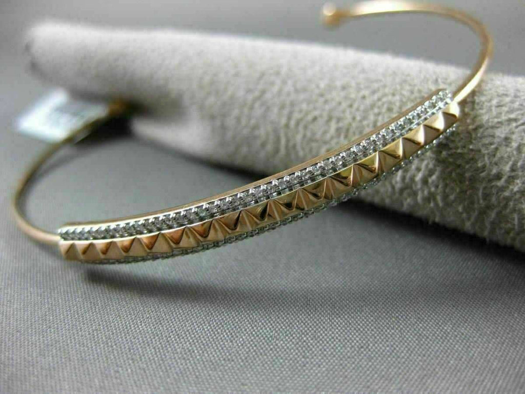 ESTATE 14KT WHITE & ROSE GOLD FUN BANGLE BRACELET. 3D PYRAMID SPIKE DESIGN. DIAMONDS ARE F/G COLOR, VSSI CLARITY .26 CARATS. MEASURES 5mm X 50.5mm x 64.5mm. FITS 6.50 -7" INCH WRIST. WRITTEN APPRAISAL AVAILABLE. COMES IN A PRESENTABLE GIFT BOX.