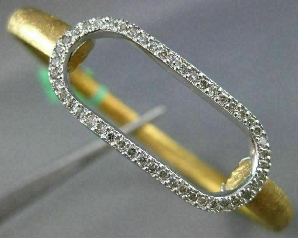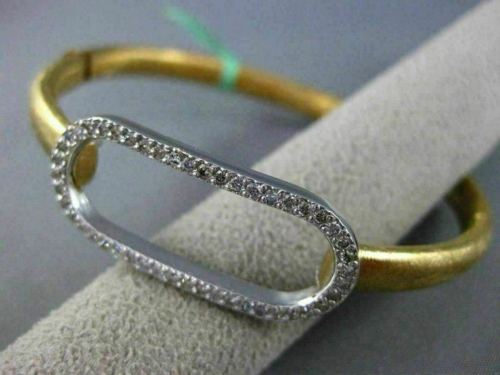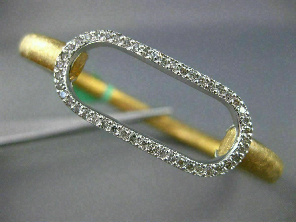 ESTATE LARGE 18KT WHITE AND YELLOW GOLD BANGLE BRACELET. OVAL MATTE AND SHINY CLASSIC LOVE DESIGN. DIAMONDS ARE F/G COLOR, VSSI CLARITY .74 CARATS. MEASURES 14mm X 58mm X 67mm. FITS 7" INCH WRIST. MADE IN ITALY. WRITTEN APPRAISAL AVAILABLE. COMES IN A PRESENTABLE GIFT BOX.