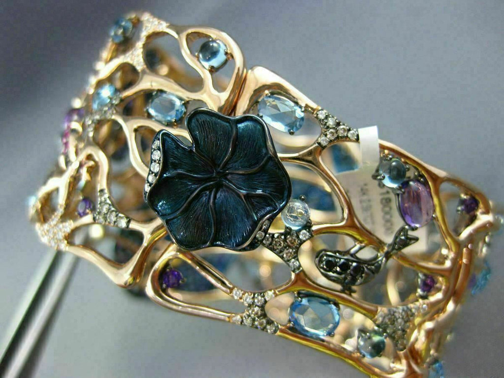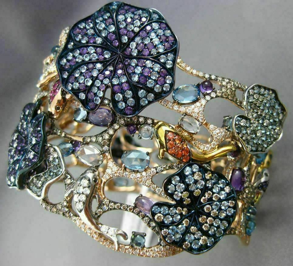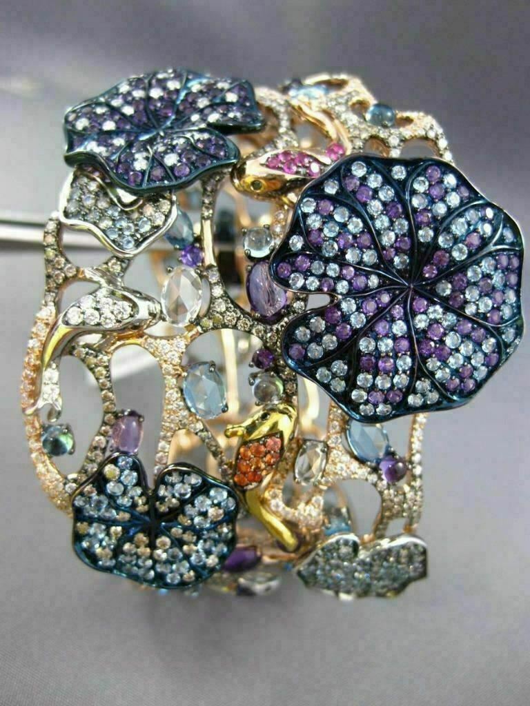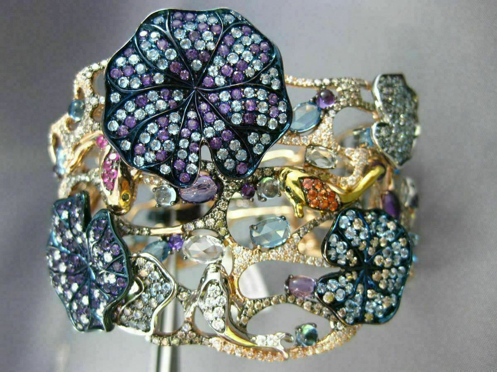 ESTATE LARGE 9.26CT MULTI COLOR DIAMOND & AAA GEM 14K GOLD AQUATIC FLOWER BANGLE