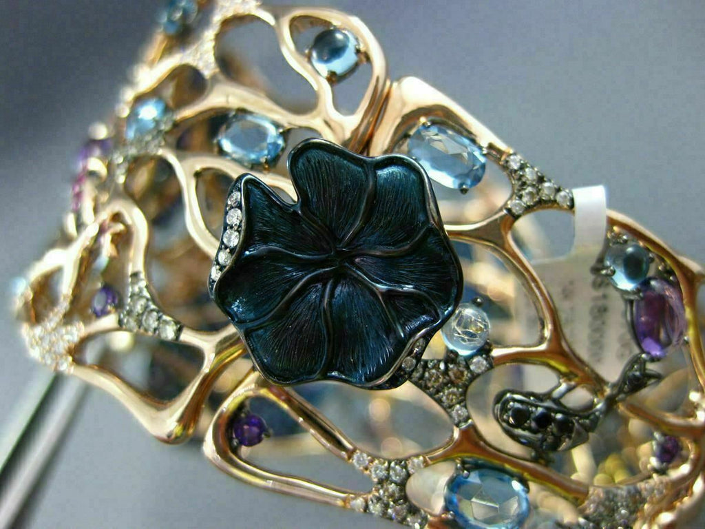 ESTATE MASSIVE 14KT WHITE, BLACK AND ROSE GOLD BANGLE BRACELET. 3D AQUATIC FLOWER ETOILE DESIGN. MULTI COLOR DIAMONDS ARE F/G COLOR, VSSI CLARITY 2.56 CARATS. AAA MULTI COLOR GEM ARE 6.70 CARATS. MEASURES 65mm X 54mm X 42.5mm WIDE. FITS 6.50-7" INCH WRIST. WRITTEN APPRAISAL AVAILABLE. COMES IN A PRESENTABLE GIFT BOX.