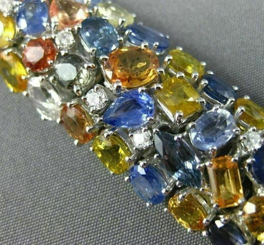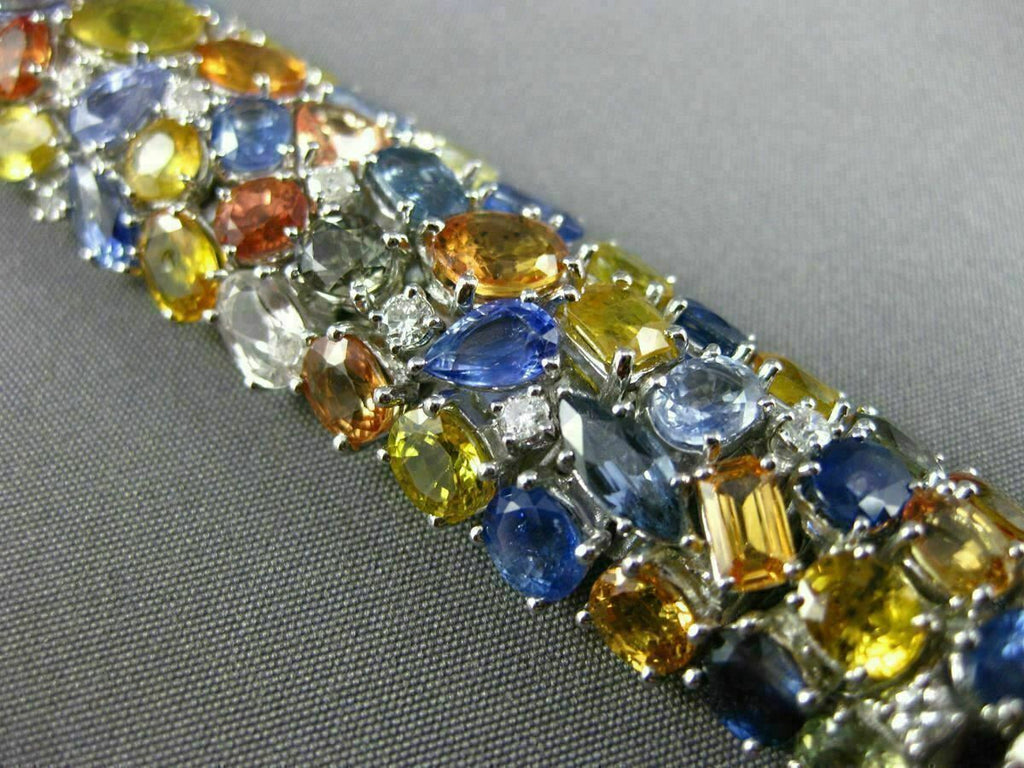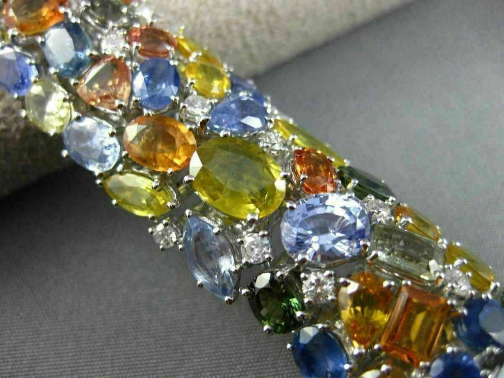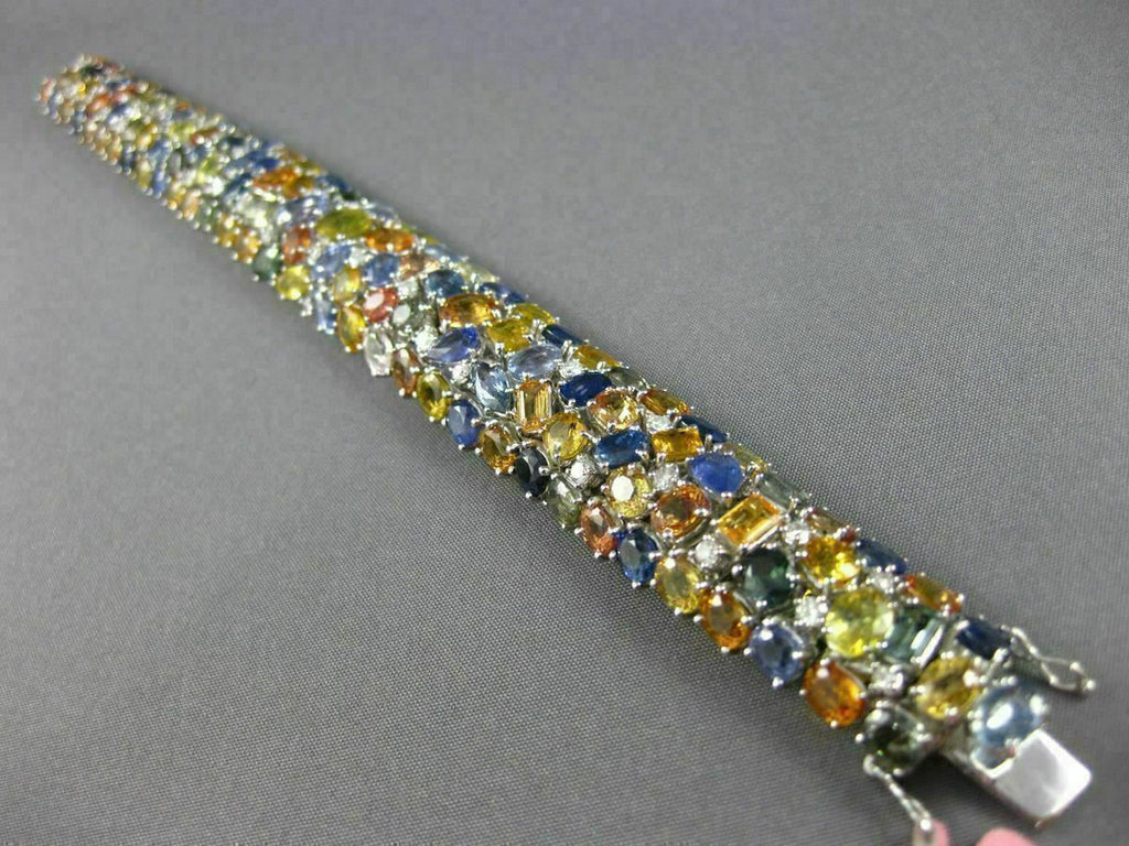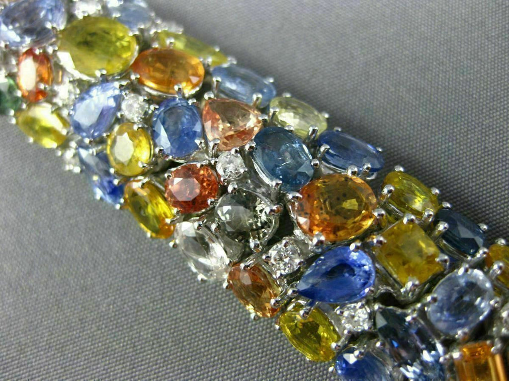 ESTATE MASSIVE 18KT WHITE GOLD BRACELET. 3D GRADUATING DESIGN. DIAMONDS ARE F/G COLOR, VSSI CLARITY 1.46 CARATS. AAA EXTRA FACET MULTI COLOR SAPPHIRES ARE 67.31 CARATS. MEASURES 18mm WIDE. 7.50" INCHES LONG. WRITTEN APPRAISAL AVAILABLE. COMES IN A PRESENTABLE GIFT BOX.