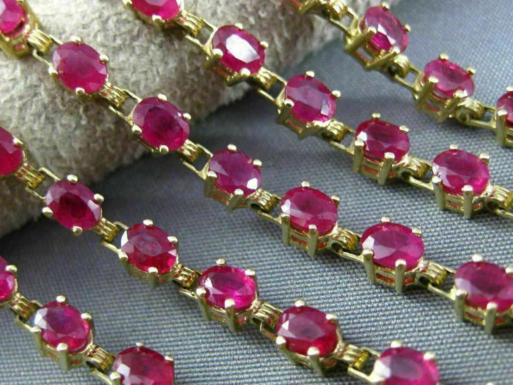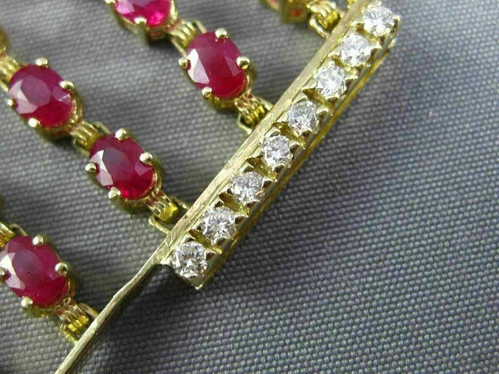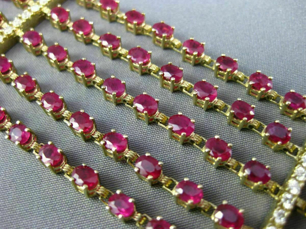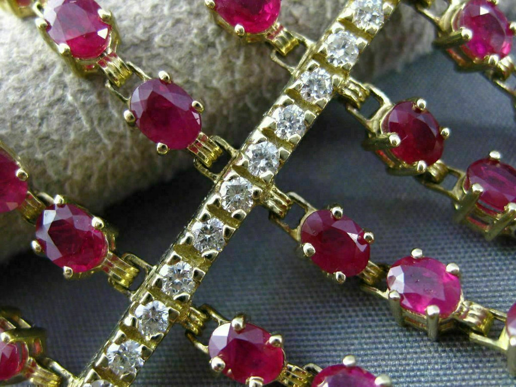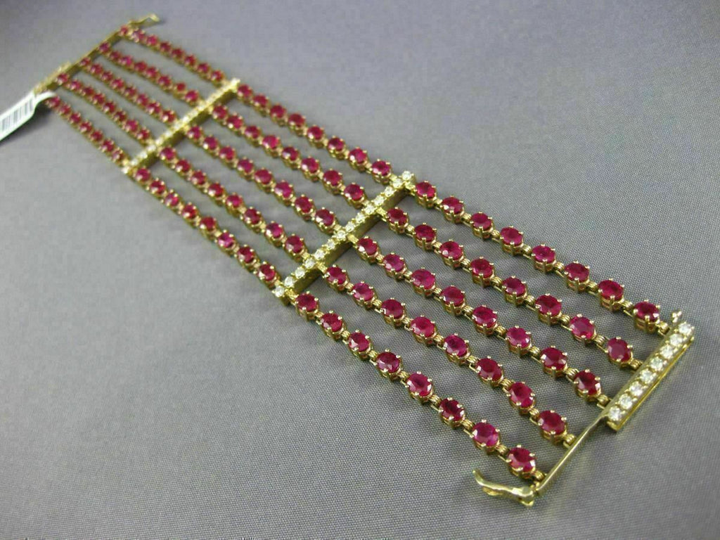 ESTATE WIDE 14KT YELLOW GOLD TENNIS BRACELET. 3D MULTI ROW DESIGN. DIAMONDS ARE F/G COLOR, VSSI CLARITY 1.23 CARATS. AAA EXTRA FACET RUBIES ARE 25.68 CARATS. MEASURES 34.5mm WIDE. 6.75" INCHES LONG. CAN BE SIZED BY OUR MASTER JEWELER UPON REQUEST. WRITTEN APPRAISAL AVAILABLE. COMES IN A PRESENTABLE GIFT BOX.