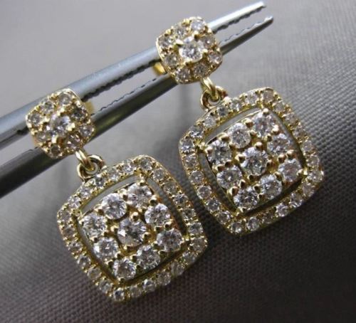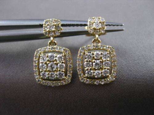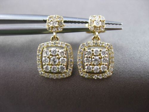 ESTATE 14KT YELLOW GOLD HANGING EARRINGS. SQUARE HALO DESIGN. DIAMONDS ARE F/G COLOR, VSSI CLARITY .62 CARATS. MEASURES 15MM X 8MM. WRITTEN APPRAISAL AVAILABLE. COMES IN PRESENTABLE GIFT BOX.