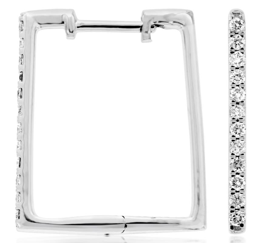 14KT WHITE GOLD HUGGIE HOOP EARRINGS. 3D ROUND SQUARE DESIGN. DIAMONDS ARE F/G COLOR, VSSI CLARITY 0.21 CARATS. WRITTEN APPRAISAL AVAILABLE. COMES IN A PRESENTABLE GIFT BOX.
