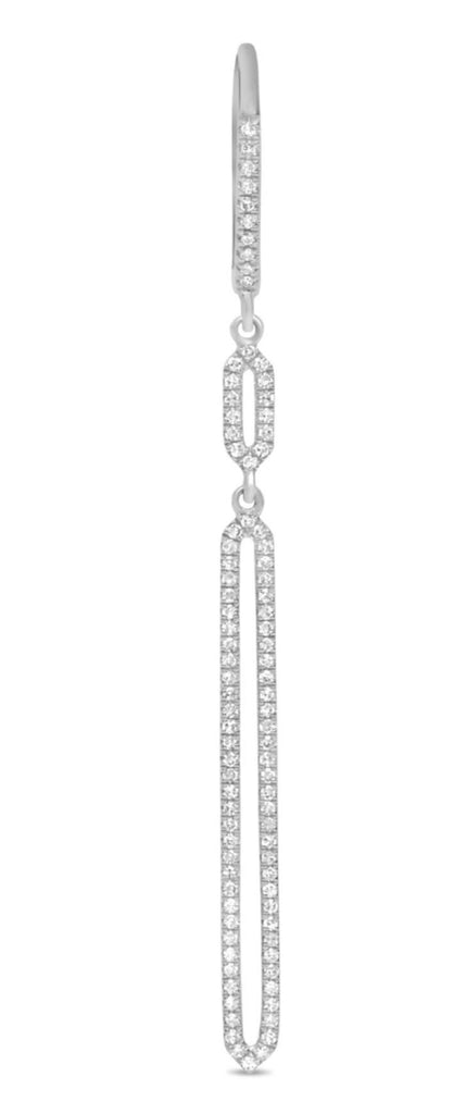 14KT WHITE GOLD LEVERBACK HANGING EARRINGS. 3D OVAL BAR ELONGATED DESIGN. DIAMONDS ARE F/G COLOR, VSSI CLARITY 0.37 CARATS. MEASURES 52mm X 3mm. WRITTEN APPRAISAL AVAILABLE. COMES IN A PRESENTABLE GIFT BOX.
