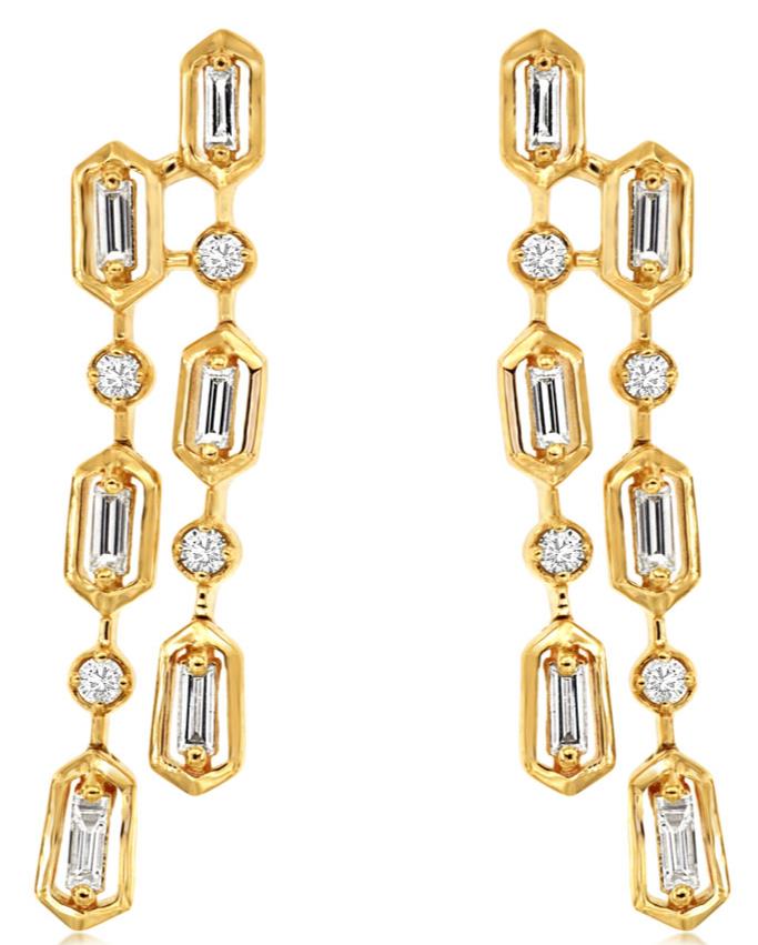 0.40CT DIAMOND 14K YELLOW GOLD ROUND & BAGUETTE 2 ROW HEXAGON CHANDELIER EARRINGS