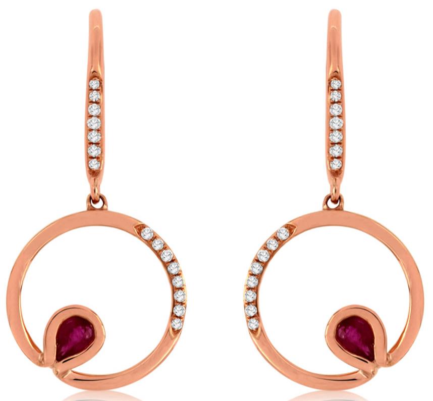 14KT ROSE GOLD LEVERBACK FUN HANGING EARRINGS. 3D CIRCUAR DESIGN. ROUND DIAMONDS ARE F/G COLOR, VSSI CLARITY .12 CARATS. AAA PEAR SHAPE RUBIES ARE .30 CARATS. WRITTEN APPRAISAL AVAILABLE. COMES IN A PRESENTABLE GIFT BOX.