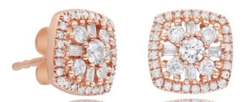 14KT ROSE GOLD STUD EARRINGS. 3D CLASSIC FLOWER SQUARE DESIGN. DIAMONDS ARE F/G COLOR, VSSI CLARITY. ROUND DIAMONDS ARE .51 CARATS. BAGUETTE DIAMONDS ARE .09 CARATS. WRITTEN APPRAISAL AVAILABLE. COMES IN A PRESENTABLE GIFT BOX.