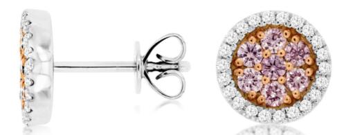 14KT WHITE AND ROSE GOLD STUD EARRINGS. 3D CLUSTER FLOWER CIRCULAR DESIGN. WHITE DIAMONDS ARE F/G COLOR, VSSI CLARITY .18 CARATS. PINK DIAMONDS ARE .42 CARATS. WRITTEN APPRAISAL AVAILABLE. COMES IN A PRESENTABLE GIFT BOX.