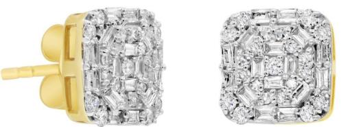 14KT YELLOW GOLD STUD EARRINGS. 3D OCTAGON SQUARE FLORAL DESIGN. DIAMONDS ARE F/G COLOR, VSSI CLARITY .61 CARATS. ROUND DIAMONDS ARE .21 CARATS. BAGUETTE DIAMONDS ARE .28 CARATS.