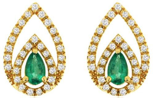 14KT YELLOW GOLD STUD EARRINGS. 3D DOUBLE HALO TEAR DROP DESIGN. ROUND DIAMONDS ARE F/G COLOR, VSSI CLARITY .25 CARATS. AAA PEAR SHAPE EMERALDS ARE .42 CARATS. WRITTEN APPRAISAL AVAILABLE. COMES IN A PRESENTABLE GIFT BOX.
