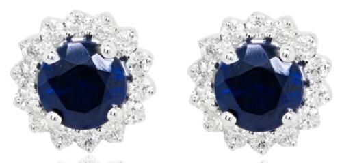 14KT WHITE GOLD STUD EARRINGS. 3D CLASSIC HALO FLOWER DESIGN. ROUND DIAMONDS ARE F/G COLOR, VSSI CLARITY .15 CARATS. AAA ROUND SAPPHIRES ARE .60 CARATS. WRITTEN APPRAISAL AVAILABLE. COMES IN A PRESENTABLE GIFT BOX.