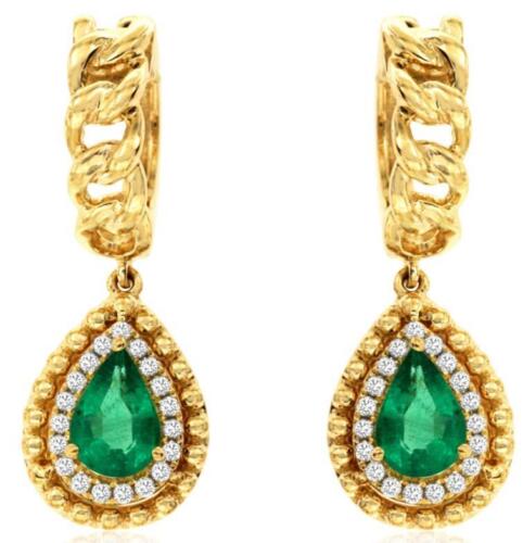 14KT YELLOW GOLD HUGGIE HANGING EARRINGS. 3D HALO FILIGREE DESIGN. ROUND DIAMONDS ARE F/G COLOR, VSSI CLARITY .13 CARATS. AAA PEAR SHAPE EMERALDS ARE .76 CARATS.