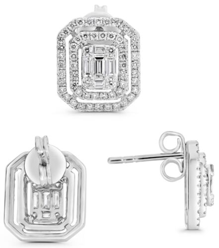 14KT WHITE GOLD STUD EARRINGS. 3D INVISIBLE DOUBLE HALO OCTAGON CLASSIC DESIGN. DIAMONDS ARE F/G COLOR, VS CLARITY. ROUND DIAMONDS ARE .65 CARATS. BAGUETTE DIAMONDS ARE .32 CARATS.