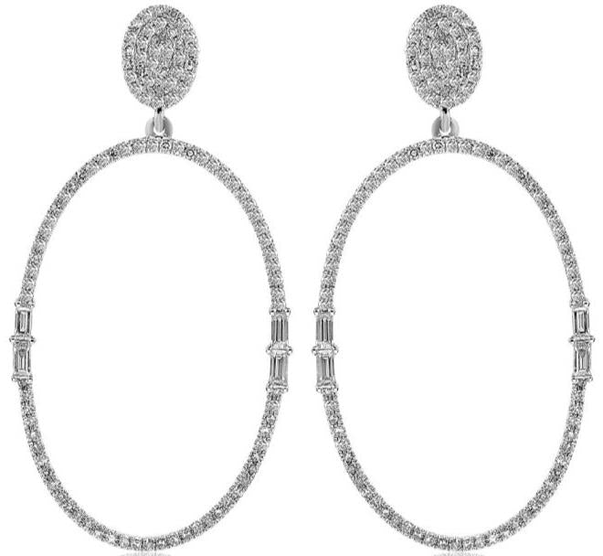 14KT WHITE GOLD HANGING EARRINGS. 3D OPEN OVAL CLASSIC DESIGN. ROUND AND BAGUETTE DIAMONDS ARE F/G COLOR, VSSI CLARITY .70 CARATS. WRITTEN APPRAISAL AVAILABLE. COMES IN A PRESENTABLE GIFT BOX.