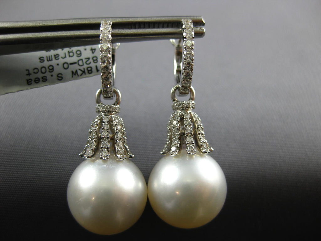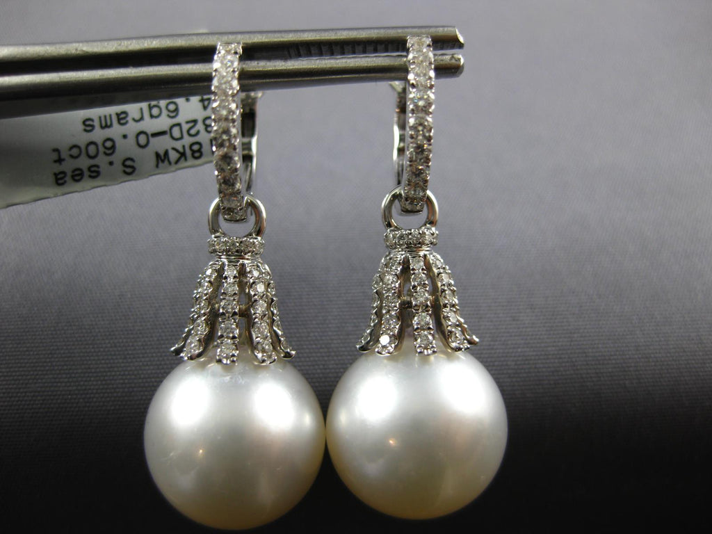 18KT WHITE GOLD HANGING EARRINGS. 3D CLASSIC CROWN DESIGN. DIAMONDS ARE F/G COLOR, VS CLARITY .60 CARATS. FEATURES AAA SOUTH SEA PEARL. MEASURES 35mm X 13.5mm. WRITTEN APPRAISAL AVAILABLE. COMES IN A PRESENTABLE GIFT BOX.
