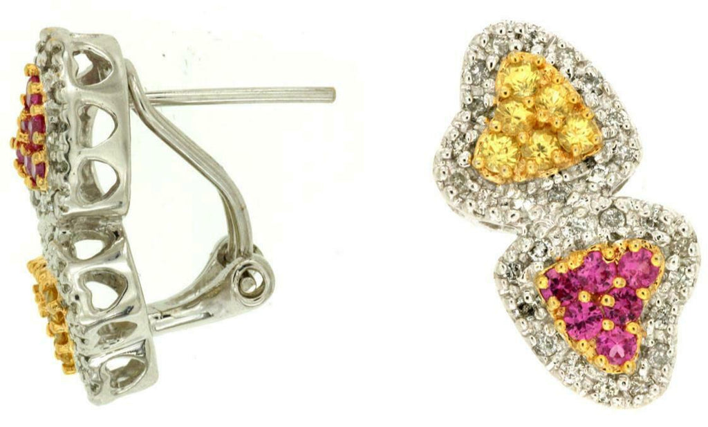 14KT WHITE GOLD CLIP ONEARRINGS. 3DDOUBLE HEARTDESIGN. DIAMONDS ARE F/G COLOR, VSSI CLARITY .36 CARATS. AAA PINK AND YELLOW SAPPHIRES ARE .65 CARATS. WRITTEN APPRAISAL AVAILABLE. COMES IN A PRESENTABLE GIFT BOX.