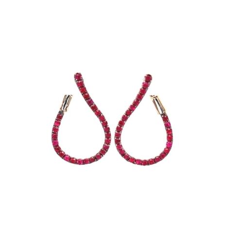 18KT ROSE GOLD HOOP HANGING EARRINGS. 3D OPEN TEAR DROP SIDEWAYS DESIGN. AAA RUBIES ARE 1.02 CARATS. WRITTEN APPRAISAL AVAILABLE. COMES IN A PRESENTABLE GIFT BOX.
