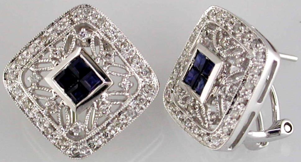 14KT WHITE GOLD CLIP ONEARRINGS. 3D FILIGREE SQUAREDESIGN. ROUND DIAMONDS ARE F/G COLOR, VSSI CLARITY .40 CARATS. AAA PRINCESS CUT SAPPHIRES ARE .62 CARATS.WRITTEN APPRAISAL AVAILABLE. COMES IN A PRESENTABLE GIFT BOX.