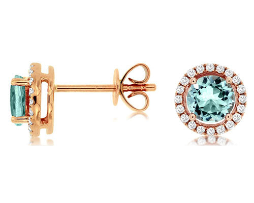 1.03CT DIAMOND & AAA AQUAMARINE 14KT ROSE GOLD CLASSIC ROUND HALO STUD EARRINGS