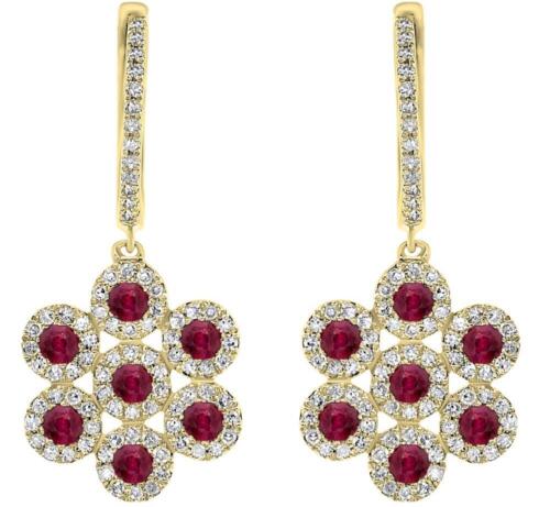 1.03CT DIAMOND & AAA RUBY 14KT YELLOW GOLD MULTI FLOWER HUGGIE HANGING EARRINGS
