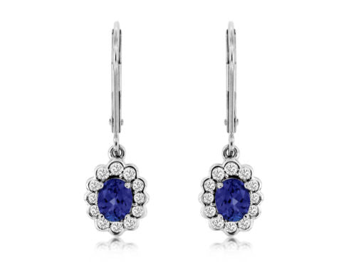 14KT WHITE GOLD LEVER BACK HANGING EARRINGS. 3D CLASSIC FLOWER DESIGN. DIAMONDS ARE F/G COLOR, VSSI CLARITY .33 CARATS. AAA TANZANITES ARE .70 CARATS. WRITTEN APPRAISAL AVAILABLE. COMES IN A PRESENTABLE GIFT BOX.
