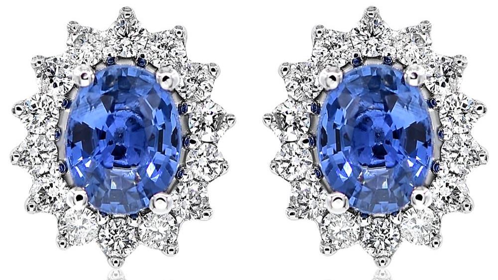 14KT WHITE GOLD STUD EARRINGS. 3D CLASSIC DESIGN. ROUND DIAMONDS ARE F/G COLOR, VSSI CLARITY .27 CARATS. AAA OVAL SAPPHIRES ARE .77 CARATS. WRITTEN APPRAISAL AVAILABLE. COMES IN A PRESENTABLE GIFT BOX.