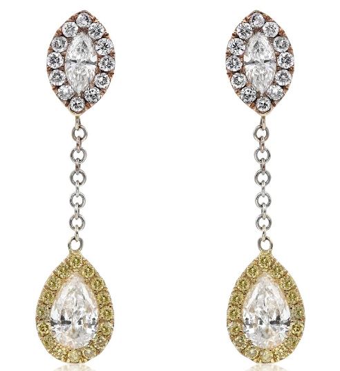 18KT WHITE, YELLOW, AND ROSE GOLD FUN HANGING EARRINGS. 3D PEAR SHAPE AND MARQUISE SHAPE TEAR DROP DESIGN. CENTER WHITE DIAMONDS ARE F/G COLOR, VSSI CLARITY .72 CARATS. FANCY YELLOW DIAMONDS ARE .15 CARATS. PINK DIAMONDS ARE .17 CARATS. WRITTEN APPRAISAL AVAILABLE. COMES IN A PRESENTABLE GIFT BOX.