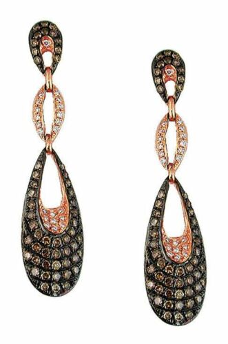 14KT ROSE GOLD HANGING EARRINGS. 3D TEAR DROP JOURNEY DESIGN. WHITE DIAMONDS ARE F/G COLOR, VSSI CLARITY .14 CARATS. CHOCOLATE FANCY DIAMONDS ARE .90 CARATS. WRITTEN APPRAISAL AVAILABLE. COMES IN A PRESENTABLE GIFT BOX.