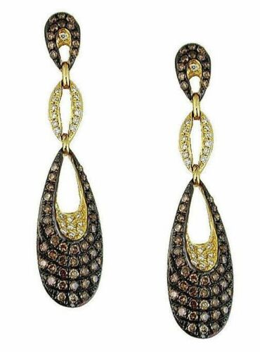 14KT YELLOW GOLD HANGING EARRINGS. 3D TEAR DROP JOURNEY DESIGN. WHITE DIAMONDS ARE F/G COLOR, VSSI CLARITY .14 CARATS. CHOCOLATE FANCY DIAMONDS ARE .90 CARATS. WRITTENN APPRAISAL AVAILABLE. COMES IN A PRESENTABLE GIFT BOX.