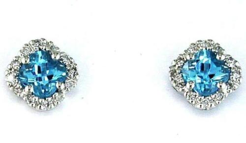 14KT WHITE GOLD STUD EARRINGS. 3D FOUR LEAF CLOVER FLOWER DESIGN. DIAMONDS ARE F/G COLOR, VSSI CLARITY .10 CARATS. AAA EXTRA FACETED BLUE TOPAZ ARE .80 CARATS. WRITTEN APPRAISAL AVAILABLE. COMES IN A PRESENTABLE GIFT BOX.