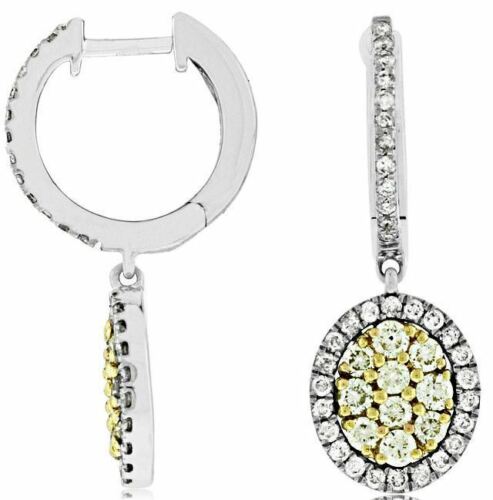 1.05CT WHITE & FANCY YELLOW DIAMOND 14K WHITE GOLD CLUSTER OVAL HANGING EARRINGS