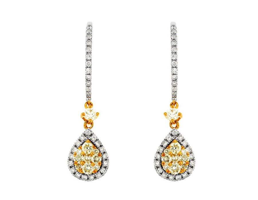 1.05CT WHITE & FANCY YELLOW DIAMOND 14KT 2 TONE GOLD CLUSTER TEAR DROP EARRINGS