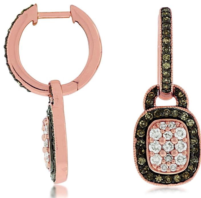 14KT ROSE GOLD HANGING EARRINGS. 3D CLUSTER SQUARE HALO FILIGREEDESIGN. WHITE DIAMONDS ARE F/G COLOR, VSSI CLARITY 0.50 CARATS. MOCHA DIAMONDS ARE 0.55 CARATS.WRITTEN APPRAISAL AVAILABLE. COMES IN A PRESENTABLE GIFT BOX.