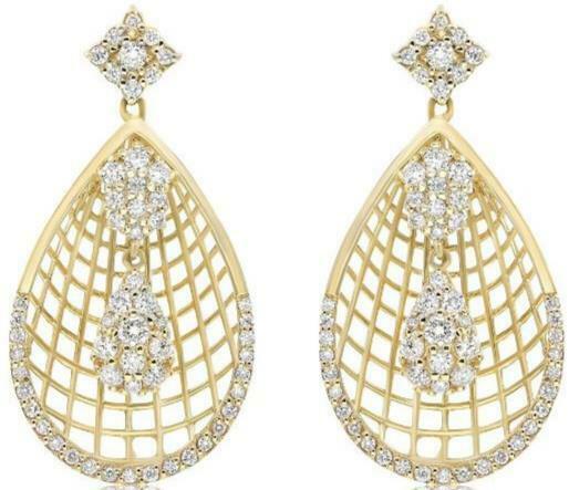1.06CT DIAMOND 18KT YELLOW GOLD 3D TEAR DROP MULTI FLOWER WEB HANGING EARRINGS