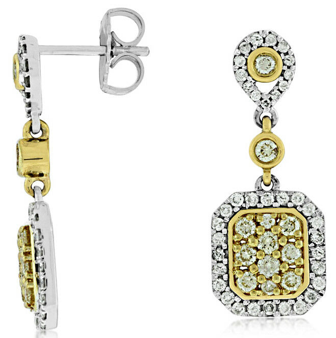 14KT WHITE GOLD HANGING EARRINGS. 3D CLUSTER SQUARE OCTAGON TEAR DROP DESIGN. WHITE DIAMONDS ARE F/G COLOR, VSSI CLARITY .46 CARATS. FANCY YELLOW DIAMONDS ARE .60 CARATS. WRITTEN APPRAISAL AVAILABLE. COMES IN A PRESENTABLE GIFT BOX.