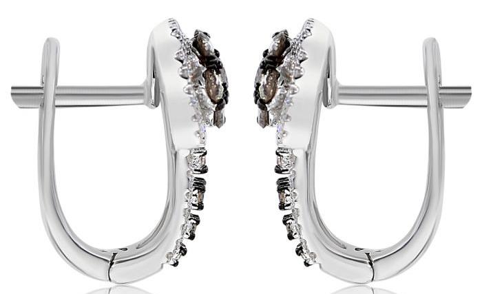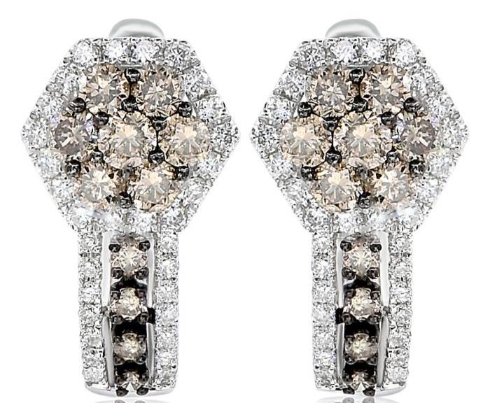 14KT WHITE GOLD HANGING EARRINGS. 3D CLUSTER HEXAGONDESIGN. WHITE DIAMONDS ARE F/G COLOR, VSSI CLARITY .34 CARATS. CHOCOLATE FANCY DIAMONDS ARE .73 CARATS. WRITTEN APPRAISAL AVAILABLE. COMES IN A PRESENTABLE GIFT BOX.
