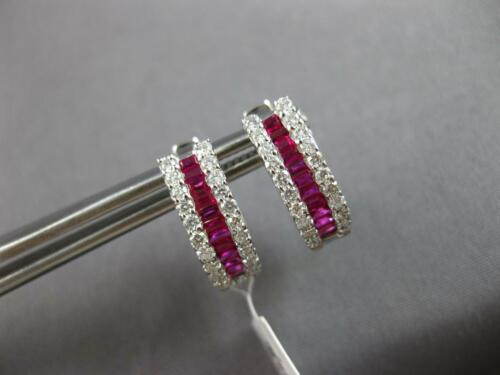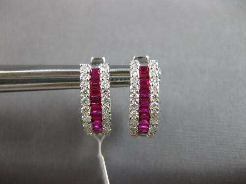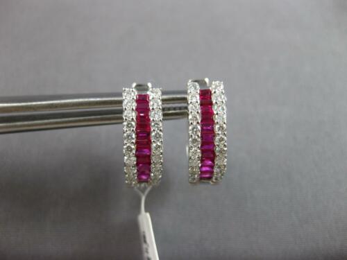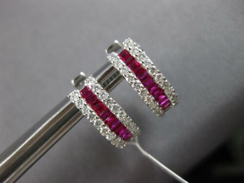 14KT WHITE GOLD HUGGIE HOOP HANGING EARRINGS. 3D CLASSIC THREE ROW DESIGN. ROUND DIAMONDS ARE F/G COLOR, VSSI CLARITY .57 CARATS. AAA BAGUETTE RUBIES ARE .52 CARATS. MEASURES 5MM WIDE. WRITTEN APPRAISAL AVAILABLE. COMES IN A PRESENTABLE GIFT BOX.