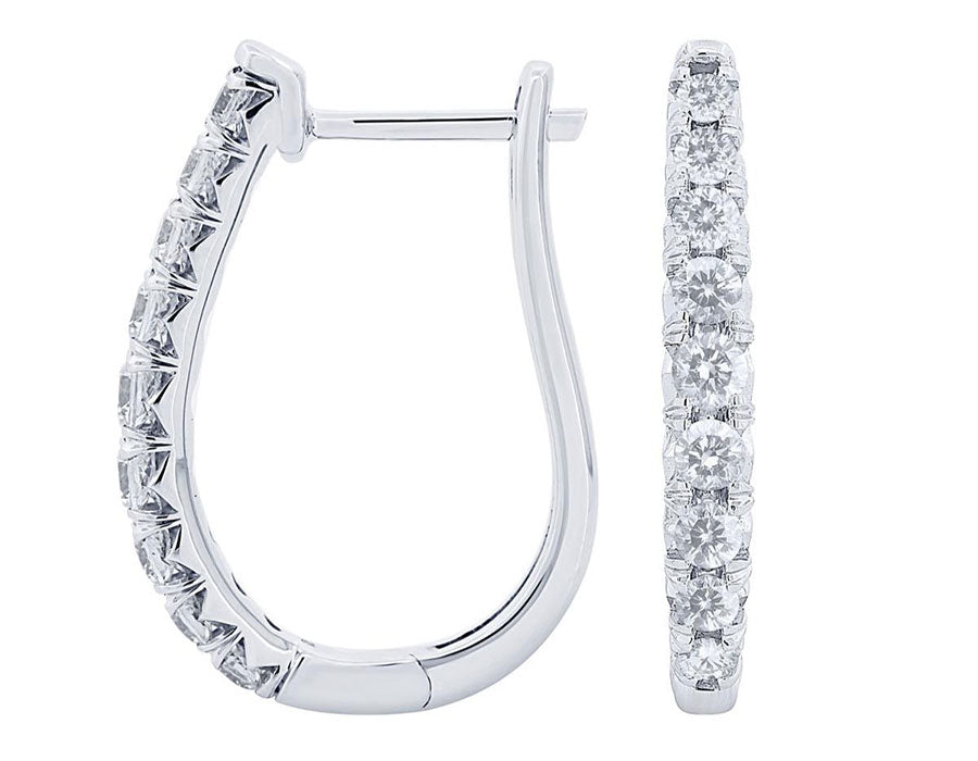 14KT WHITE GOLD LEVERBACK HUGGIE HOOP HANGING EARRINGS. 3D CLASSIC OVAL DESIGN. ROUND DIAMONDS ARE F/G COLOR, VSSI CLARITY 1.0 CARAT. WRITTEN APPRAISAL AVAILABLE. COMES IN A PRESENTABLE GIFT BOX.