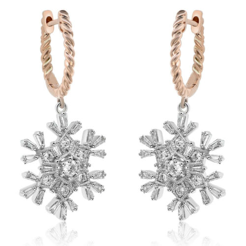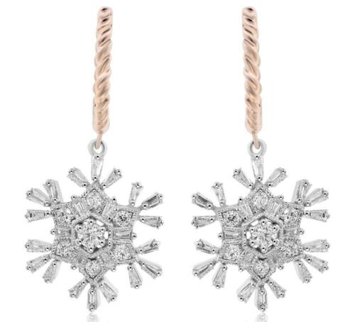 1.0CT DIAMOND 14KT WHITE & ROSE GOLD ROUND & BAGUETTE SNOWFLAKE HANGING EARRINGS