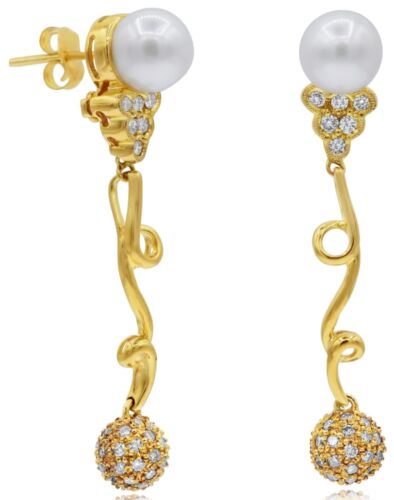 14KT YELLOW GOLD FUN HANGING EARRINGS. 3D FLORAL DOUBLE SWIRL DESIGN. ROUND DIAMONDS ARE F/G COLOR, VSSI CLARITY 1.0 CARAT. FEATURES AAA ROUND SOUTH SEA PEARL.