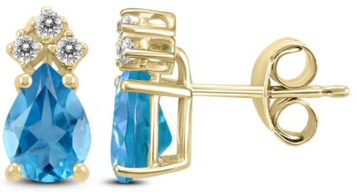 14KT YELLOW GOLD STUD EARRINGS. 3D DESIGN. ROUND DIAMONDS ARE G/H COLOR, SI CLARITY .10 CARATS. AAA EXTRA FACETED PEAR SHAPE BLUE TOPAZ ARE 1.0 CARAT.