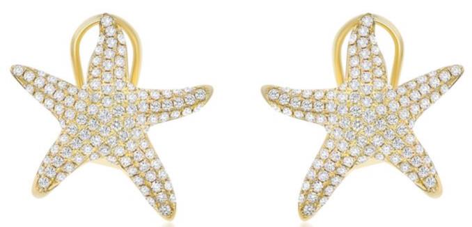 14KT YELLOW GOLD CLIP ON FUNEARRINGS. 3D MULTI ROW CLASSIC STARFISHDESIGN. DIAMONDS ARE F/G COLOR, VSSI CLARITY 1.11 CARATS. WRITTEN APPRAISAL AVAILABLE. COMES IN A PRESENTABLE GIFT BOX.