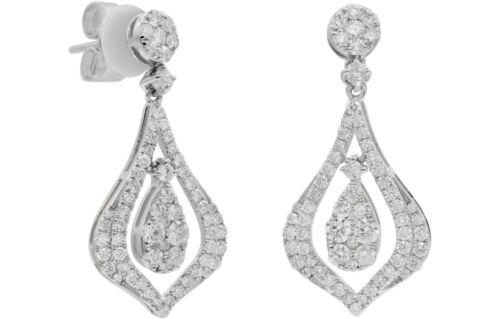 14KT WHITE GOLD HANGING EARRINGS. 3D CLASSC DOUBLE TEAR DROP FLOWER DESIGN. ROUND DIAMONDS ARE F/G COLOR, VSSI CLARITY 1.17 CARATS.
