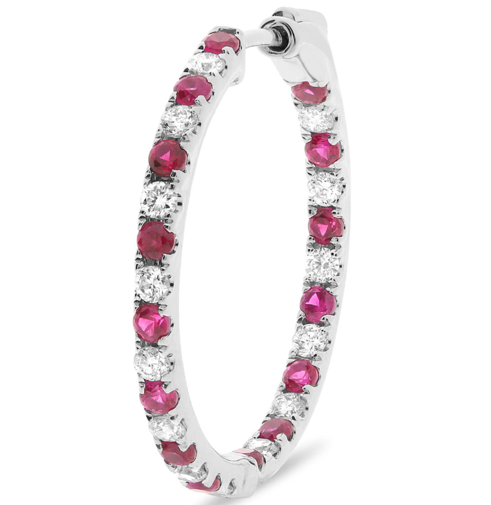 14KT WHITE GOLD HOOP HANGING EARRINGS. 3D CLASSIC INSIDE OUT DESIGN. ROUND DIAMONDS ARE F/G COLOR, VSSI CLARITY .45 CARATS. AAA RUBIES ARE .72 CARATS. MEASURES .75 INCHES WIDE. WRITTEN APPRAISAL AVAILABLE. COMES IN A PRESENTABLE GIFT BOX.