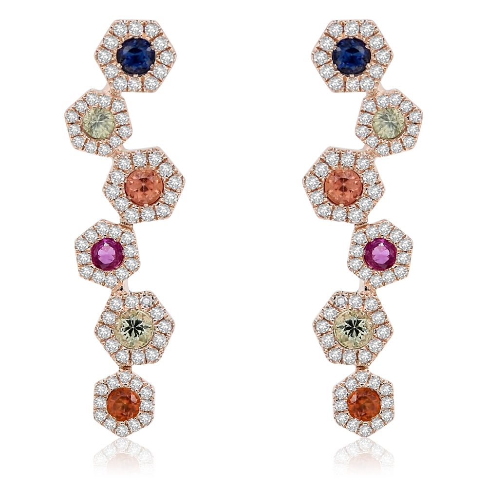 1.17CT DIAMOND & MULTI COLOR SAPPHIRE 14KT ROSE GOLD MULTI HEXAGON EARRINGS