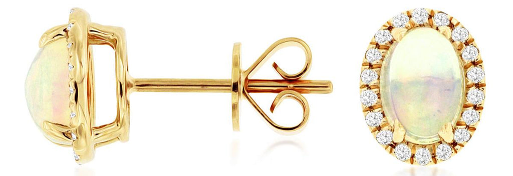 14KT YELLOW GOLD STUD EARRINGS. 3D CLASSIC HALO FLOWER DESIGN. ROUND DIAMONDS ARE F/G COLOR, VSSI CLARITY .19 CARATS. AAA OVAL OPALS ARE 1.0 CARAT. WRITTEN APPRAISAL AVAILABLE. COMES IN A PRESENTABLE GIFT BOX.