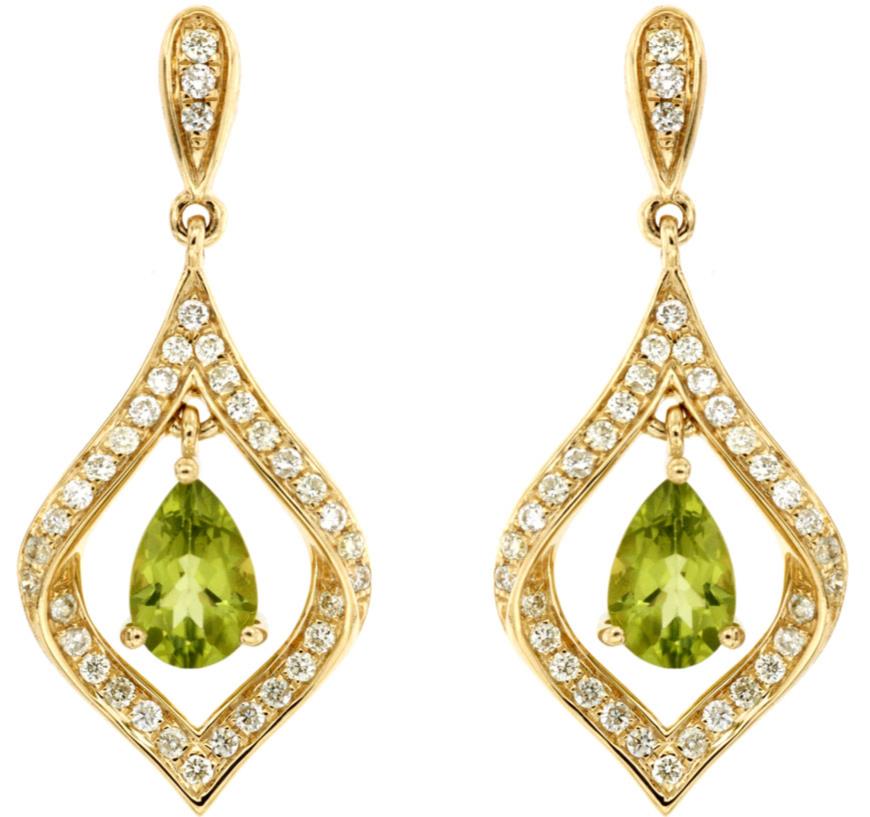 14KT YELLOW GOLD HANGING EARRINGS. 3D CLASSIC TEAR DROP LEAF DESIGN. ROUND DIAMONDS ARE F/G COLOR, VSSI CLARITY .29 CARATS. AAA EXTRA FACETED PEAR SHAPE PERIDOTS ARE .90 CARATS. WRITTEN APPRAISAL AVAILABLE. COMES IN A PRESENTABLE GIFT BOX.