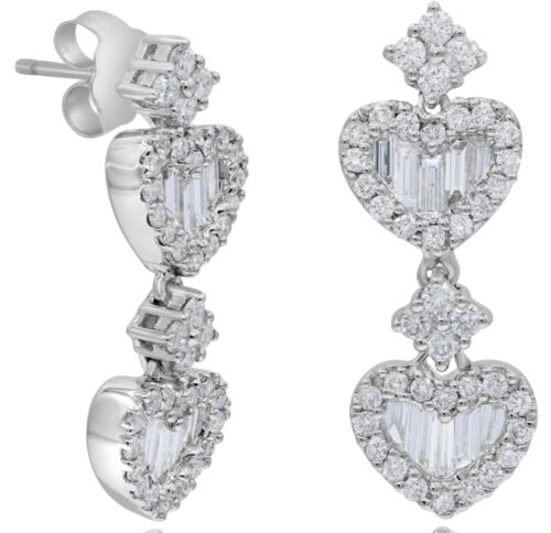 18KT WHITE GOLD FUN HANGING EARRINGS. 3D DOUBLE HEART FLORAL DESIGN. DIAMONDS ARE F/G COLOR, VSSI CLARITY 1.20 CARATS. ROUND DIAMONDS ARE .66 CARATS. BAGUETTE DIAMONDS ARE .54 CARATS.